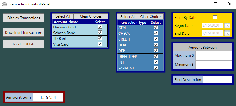 You can view transactions based on any combination of account, transaction type, date, amount and description.