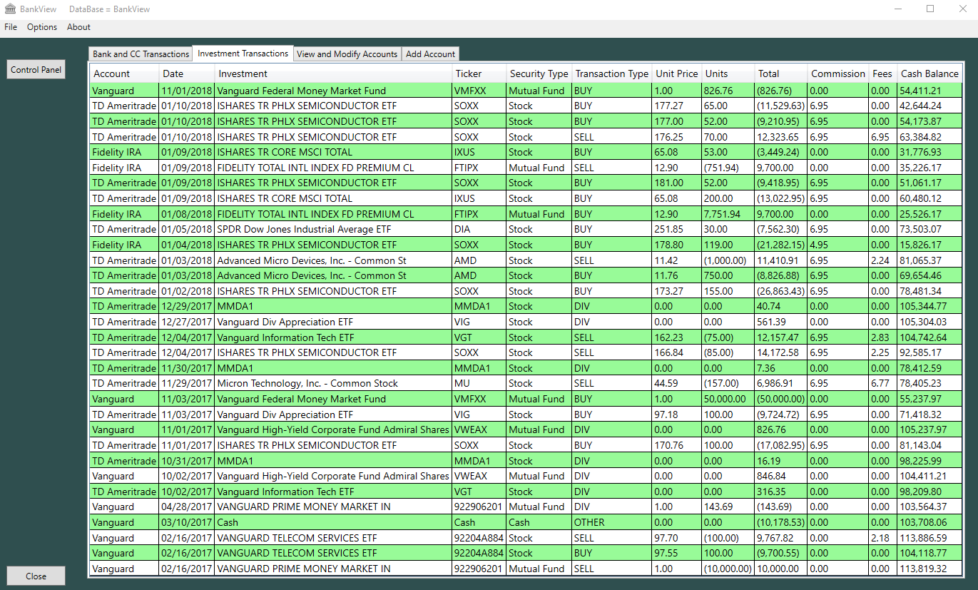 There are two transaction display tabs: Bank & Credit-Card and Investments.