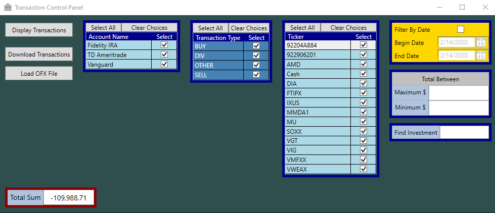 The sum of the selected transactions amounts is shown in the box at the lower left.